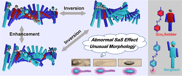 Abstract:Controlling the secondary phase in chiral liquid-crystalline(LC)polymers is of great importance since it transfers and amplifies molecular information to the macroscopic properties. However, the chiral superstructures of the LC phase are determined exclusively by the inherent configuration of the parent chiral source. Here, we report the switchable supramolecular chirality of heteronuclear structures by the untraditional command between common chiral sergeant units and various achiral soldier units. Different chiral induction pathways between sergeants and soldiers were observed for copolymer assemblies with mesogenic and non-mesogenic soldier units, demonstrating the formation of a helical phase independent of the absolute configuration of the stereocenter. In the presence of non-mesogenic soldier units,the classical SaS (Sergeants and Soldiers) effect in the amorphous phase was observed; whereas in a full LC system, bidirectional command of sergeants was activated in response to the phase transition. Meanwhile,a full spectrum of morphological phase diagrams including spherical micelles, worms, nanowires, spindles, tadpoles, anisotropic ellipsoidal vesicles, and isotropic spherical vesicles were successfully achieved.Such spindles, tadpoles, and anisotropic ellipsoidal vesicles have rarely been obtained previously from chiral polymer systems.