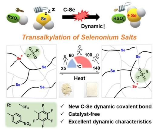 Abstract: Covalent adaptable networks (CANs) possess unique properties as a result of their internal dynamic bonds, such as self-healing and reprocessing abilities. In this study, we report a thermally responsive C−Se dynamic covalent chemistry (DCC) that relies on the transalkylation exchange between selenonium salts and selenides, which undergo a fast transalkylation reaction in the absence of any catalyst. Additionally, we demonstrate the presence of a dissociative mechanism in the absence of selenide groups. After incorporation of this DCC into selenide-containing polymer materials, it was observed that the cross-linked networks display varying dynamic exchange rates when using different alkylation reagents, suggesting that the reprocessing capacity of selenide-containing materials can be regulated. Also, by incorporating selenonium salts into polymer materials, we observed that the materials exhibited good healing ability at elevated temperatures as well as excellent solvent resistance at ambient temperature. This novel dynamic covalent chemistry thus provides a straightforward method for the healing and reprocessing of selenide-containing materials.