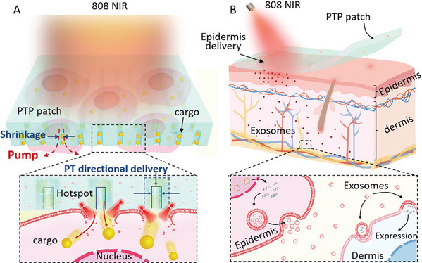 Abstract:The development of a highly efficient, nondestructive, and in vitro/vivo-applicable universal delivery strategy of therapeutic macromolecules into desired cells and tissues is very challenging. Photothermal methods have advantages in intracellular delivery, particularly in in vivo manipulation. However, the inability of directional transmission of exogenous molecules limits their delivery efficiency. Here, a photothermal pump (PTP) patch with numerous exogenous molecular reservoirs is reported. Under a laser, the cell membrane ruptures, while exogenous molecular reservoirs shrink, resulting in a directional exogenous molecule delivery into cells for a high-efficient intracellular delivery. The PTP patches are considered a universal structure for a highly efficient, nondestructive, and in-vitro/vivo-applicable intracellular macromolecule delivery. Under in vivo transdermal intracellular delivery conditions, the target genes are efficiently and noninvasively delivered into epidermal and dermal cells through the PTP patch and exosomes produced by the epidermal cells, respectively. The PTP patch provides a new strategy for a high-efficiency, nondestructive, and in-vitro/vivo-applicable macromolecule delivery.