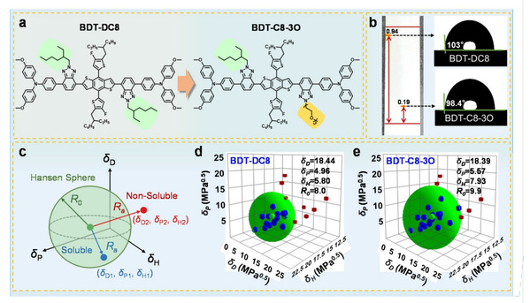 Abstract:The use of dopant-free hole transport layers (HTLs) is critical in stabilizing n-i-p perovskite solar cells (pero-SCs). However, these HTL materials are often processed with toxic solvents, which is not ideal for industrial production. Upon substituting them with green solvents, a trade-off emerges between maintaining the high crystallinity of the HTL materials and ensuring high solubility in the new solvents. In this paper, we designed a novel, linear, organic small molecule, BDT-C8-3O, by introducing an asymmetric polar oligo(ethylene glycol) side chain. This method not only overcomes the solubility limitations in green solvents but also enables stacking the conjugated main chains in two patterns, which further enhances crystallinity and hole mobility. As a result, the n-i-p pero-SCs based on chlorobenzene- or green (natural compound) solvent 3-methylcyclohexanone-processed BDT-C8-3O HTL that without any dopant delivered world-recorded power conversion efficiencies of 24.11 % (certified of 23.82 %) and 23.53 %, respectively. The devices also demonstrated remarkable operational and high-temperature stabilities, maintaining over 84 % and 79.5 % of their initial efficiency for 2000 h, respectively. Encouragingly, dopant-free BDT-C8-3O HTL exhibits significant advantages in large-area fabrication, achieving state-of-the-art PCEs exceeding 20 % for 5x5 cm2 modules (active area: 15.64 cm2), even when processed using green solvents.