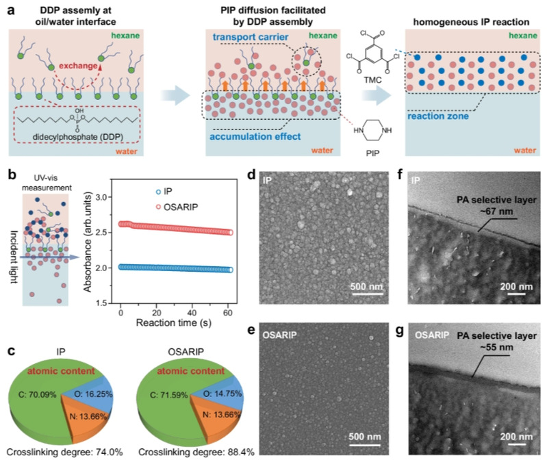 Abstract: Achieving high selectivity of Li+ and Mg2+ is of paramount importance for effective lithium extraction from brines, and nanofiltration (NF) membrane plays a critical role in this process. The key to achieving high selectivity lies in the on-demand design of NF membrane pores in accordance with the size difference between Li+ and Mg2+ ions, but this poses a huge challenge for traditional NF membranes and difficult to be realized. In this work, we report the fabrication of polyamide (PA) NF membranes with ultra-high Li+/Mg2+ selectivity by modifying the interfacial polymerization (IP) process between piperazine (PIP) and trimesoyl chloride (TMC) with an oil-soluble surfactant that forms a monolayer at oil/water interface, referred to as OSARIP. The OSARIP benefits to regulate the membrane pores so that all of them are smaller than Mg2+ ions. Under the solely size sieving effect, an exceptional Mg2+ rejection rate of over 99.9% is achieved. This results in an exceptionally high Li+/Mg2+ selectivity, which is one to two orders of magnitude higher than all the currently reported pressure-driven membranes, and even higher than the microporous framework materials, including COFs, MOFs, and POPs. The large enhancement of ion separation performance of NF membranes may innovate the current lithium extraction process and greatly improve the lithium extraction efficiency.