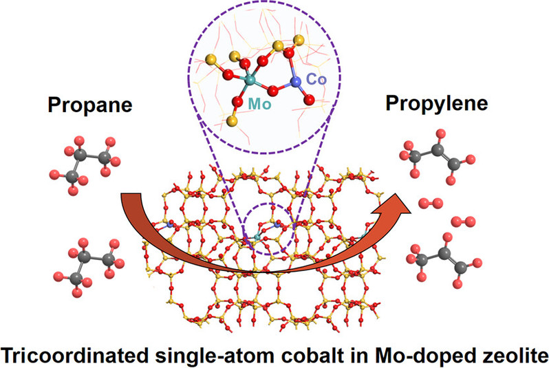 Abstract: Propane dehydrogenation (PDH) reaction has emerged as one of the most promising propylene production routes due to its high selectivity for propylene and good economic benefits. However, the commercial PDH processes usually rely on expensive platinum-based and poisonous chromium oxide based catalysts. The exploration of cost-effective and ecofriendly PDH catalysts with excellent catalytic activity, propylene selectivity, and stability is of great significance yet remains challenging. Here, we discovered a new active center, i.e., an unsaturated tricoordinated cobalt unit (≡Si–O)CoO(O–Mo) in a molybdenum-doped silicalite-1 zeolite, which afforded an unprecedentedly high propylene formation rate of 22.6 molC3H6 gCo–1 h–1 and apparent rate coefficient of 130 molC3H6 gCo–1 h–1 bar–1 with >99 % of propylene selectivity at 550 °C. Such activity is nearly one magnitude higher than that of previously reported Co-based catalysts in which cobalt atoms are commonly tetracoordinated, and even superior to that of most of Pt-based catalysts under similar operating conditions. Density functional theory calculations combined with the state-of-the-art characterizations unravel the role of the unsaturated tricoordinated Co unit in facilitating the C–H bond-breaking of propane and propylene desorption. The present work opens new opportunities for future large-scale industrial PDH production based on inexpensive non-noble metal catalysts.