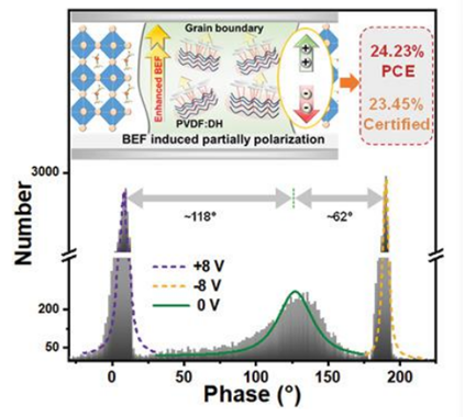 The built-in electric field (BEF) intensity of silicon heterojunction solar cells can be easily enhanced by selective doping to obtain high power conversion efficiencies (PCEs), while it is challenging for perovskite solar cells (pero-SCs) because of the difficulty in doping perovskites in a controllable way. Herein, an effective method is reported to enhance the BEF of FA0.92MA0.08PbI3 perovskite by doping an organic ferroelectric material, poly(vinylidene fluoride):dabcoHReO4 (PVDF:DH) with high polarizability, that can be driven even by the BEF of the device itself. The polarization of PVDF:DH produces an additional electric field, which is maintained permanently, in a direction consistent with that of the BEF of the pero-SC. The BEF superposition can more sufficiently drive the charge-carrier transport and extraction, thus suppressing the nonradiative recombination occurring in the pero-SCs. Moreover, the PVDF:DH dopant benefits the formation of a mesoporous PbI2 film, via a typical two-step processing method, thereby promoting perovskite growth with high crystallinity and a few defects. The resulting pero-SC shows a promising PCE of 24.23% for a 0.062 cm2 device (certified PCE of 23.45%), and a remarkable PCE of 22.69% for a 1 cm2 device, along with significantly improved moisture resistances and operational stabilities.