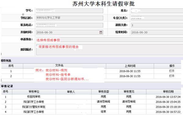 2、病假:学生填写个人信息、明确的请假理由、请假日期,上传就诊材料照片,提交--校医院审核--辅导员审核--学部教学院长审核--辅导员(结束)